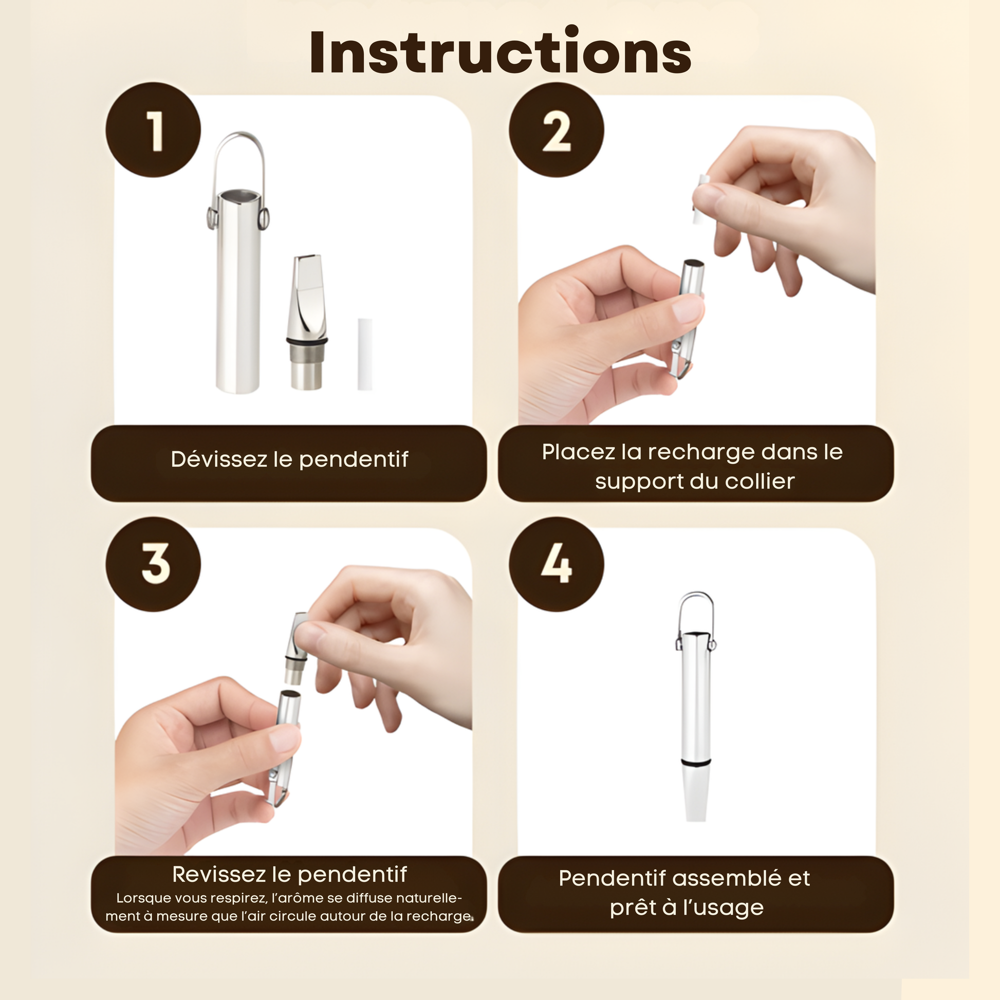 Son utilisation est simple : dévissez le collier, insérez une recharge aromatisée et inhalez lentement lorsque l’envie se fait sentir. La résistance respiratoire et l’arôme agissent ensemble pour apporter une sensation de satisfaction. Des instructions étape par étape sont incluses. Le dispositif est sans nicotine, sans vapeur, sans produits chimiques, et composé d’arômes naturels.